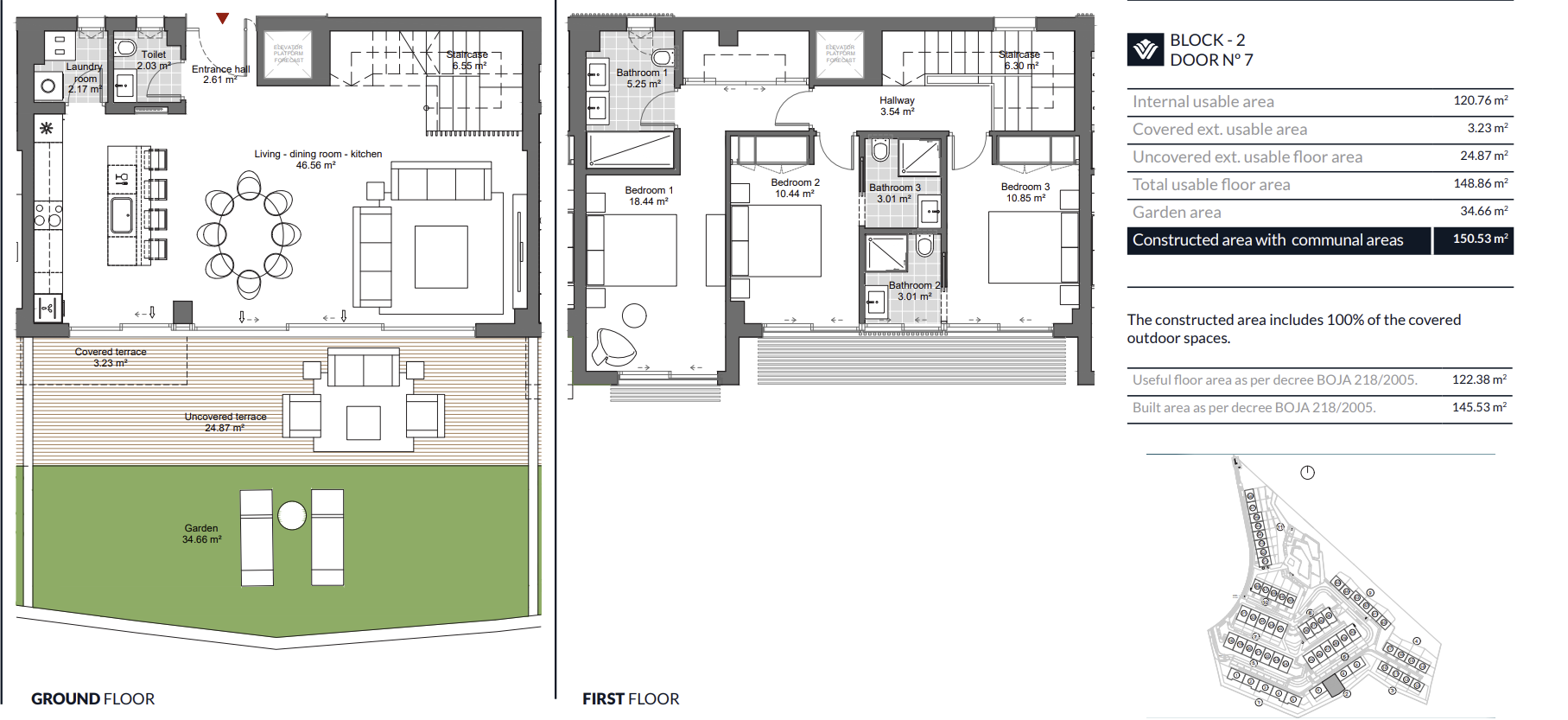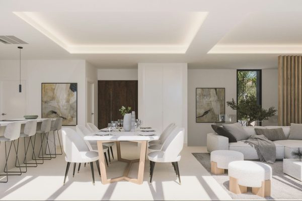 Wejście do mieszkania prowadzi nas do przestronnego salonu z dużymi oknami, które zapewniają naturalne oświetlenie i zapierający dech w piersiach widok na otaczającą przyrodę. Dzięki oknom sięgającym od podłogi do sufitu i podwójnym fasadom, domy te zostały zaprojektowane tak, aby zmaksymalizować światło i ciepło, jakie Costa del Sol oferuje przez cały rok.